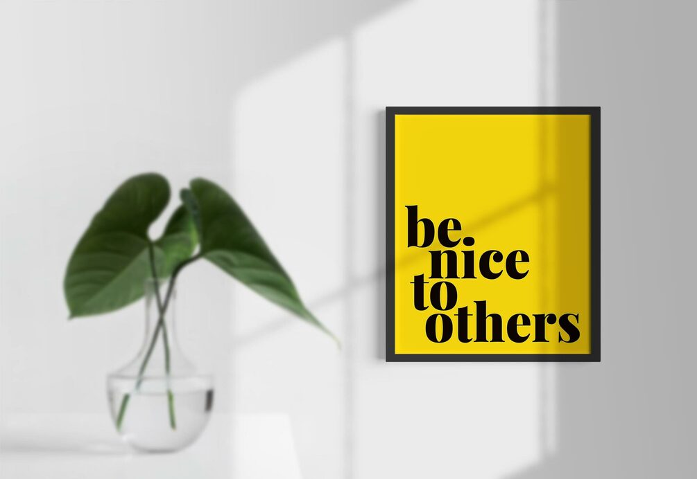 Graphic typography poster with the quote "Be nice to others" in black and yellow. A lovely way to add a bit of color to your home or give as a gift.