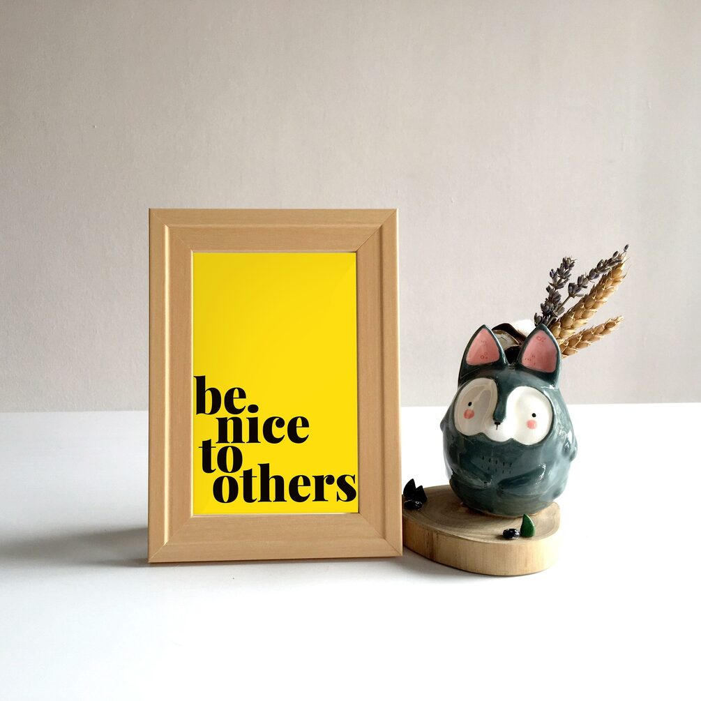 Graphic typography poster with the quote "Be nice to others" in black and yellow. A lovely way to add a bit of color to your home or give as a gift.