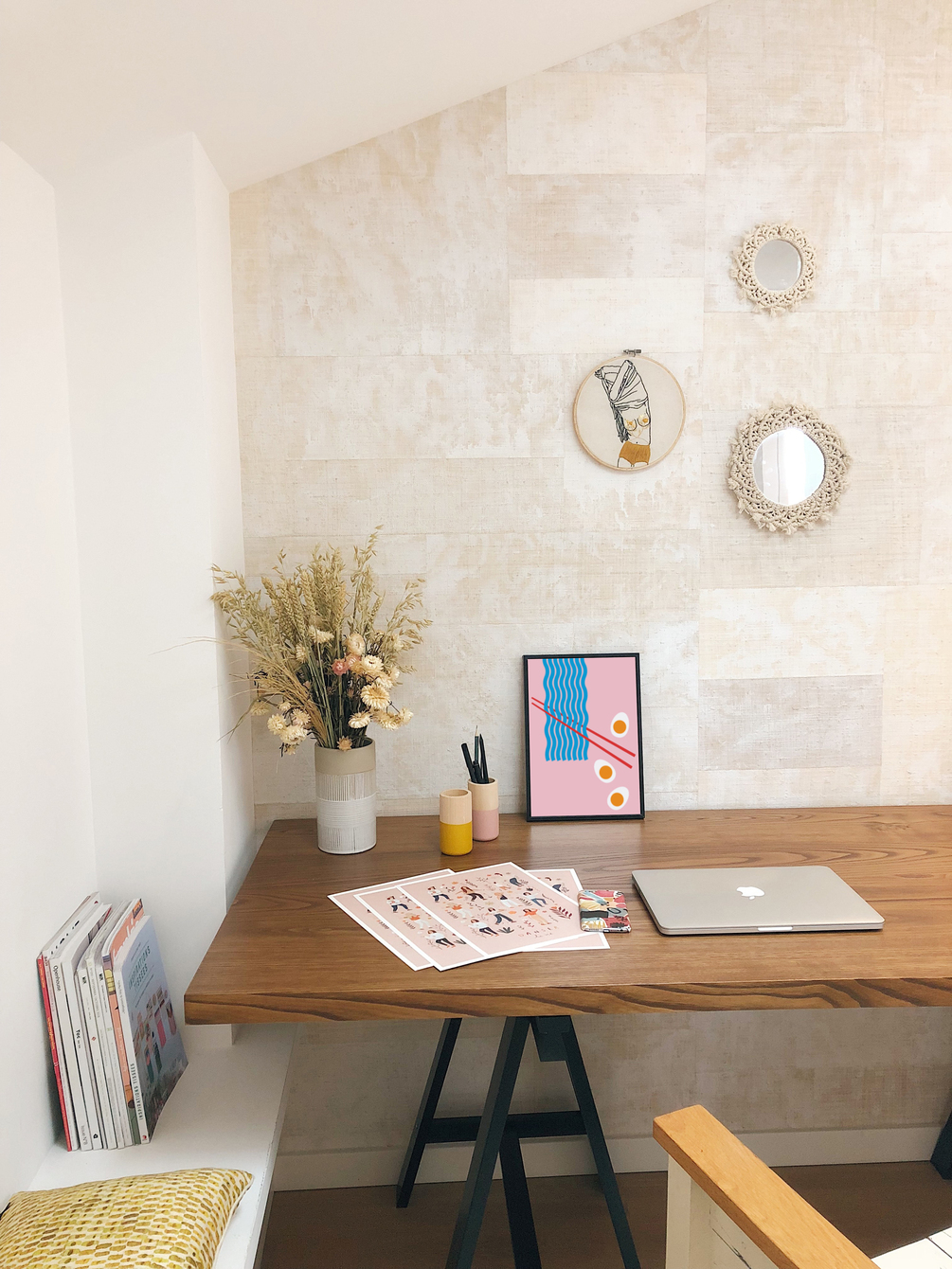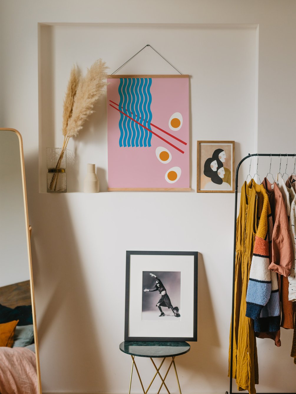 Minimalistic graphic ramen poster with eggs and chopsticks in pink in A1 format. A fun way to add a bit of color to your kitchen or give as a gift to a foodie.