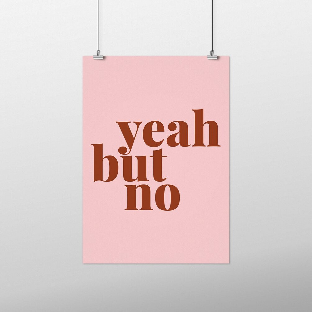 Graphic typography poster with the quote "Yeah but no" in pink and brown. A lovely way to add a bit of color to your home or give as a gift.