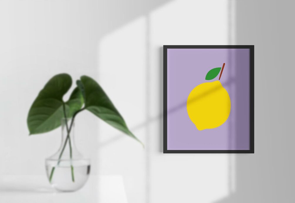 Minimalistic graphic yellow lemon poster with lilac background in A1 format. A fun way to add a bit of color to your kitchen or give as a gift to a foodie.